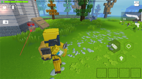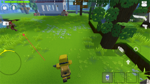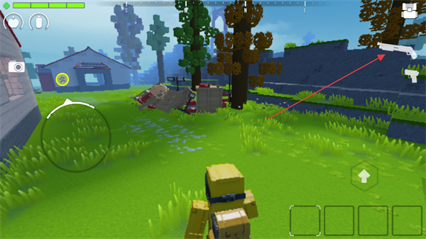 1、在方塊世界中移動,切換武器如手槍,探索房屋、樹林等區(qū)域,尋找資源和敵人。
