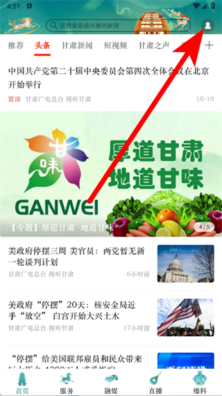 1、打開視聽甘肅,點(diǎn)擊頁面右上角的個(gè)人圖標(biāo)。