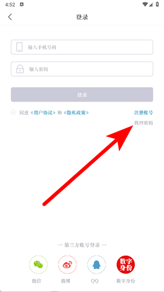 3、在登錄頁面,點(diǎn)擊找回密碼,進(jìn)入找回密碼頁面。