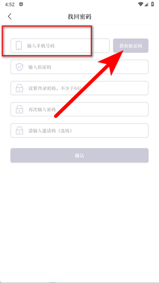 4、在找回密碼頁面,輸入手機(jī)號碼,點(diǎn)擊獲取驗(yàn)證碼。