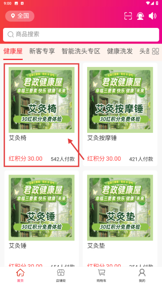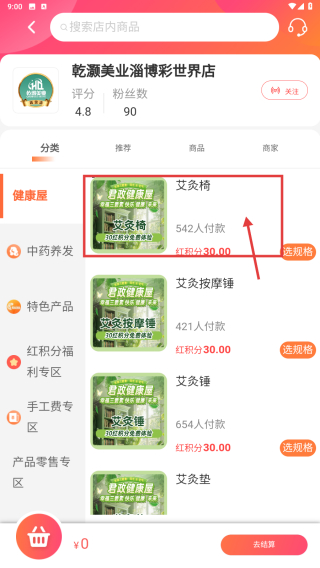 2、在健康屋商品列表頁(yè)面,找到艾灸椅商品條目,點(diǎn)擊進(jìn)入店鋪商品頁(yè)面。