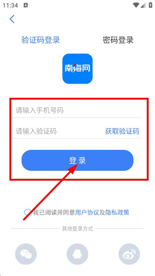 4、在驗(yàn)證碼登錄頁面,輸入手機(jī)號碼、驗(yàn)證碼,點(diǎn)擊登錄,完成賬號登錄。