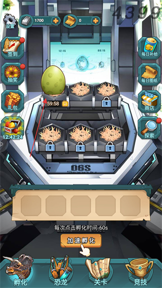 3、通過孵化龍蛋獲取恐龍,孵蛋時(shí)點(diǎn)擊加速孵化,縮短龍蛋孵化時(shí)間。