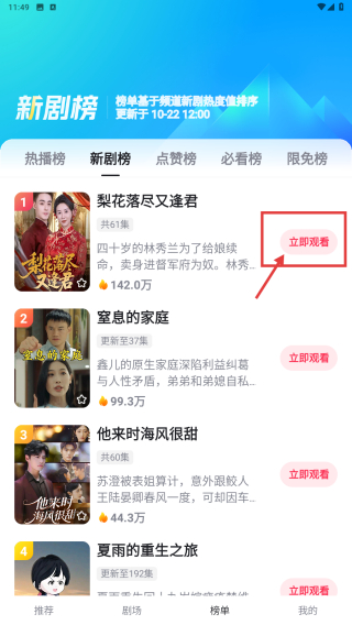 3、在新劇榜單里,找到梨花落盡又逢君短劇條目,點擊立即觀看按鈕,進入短劇播放頁面。