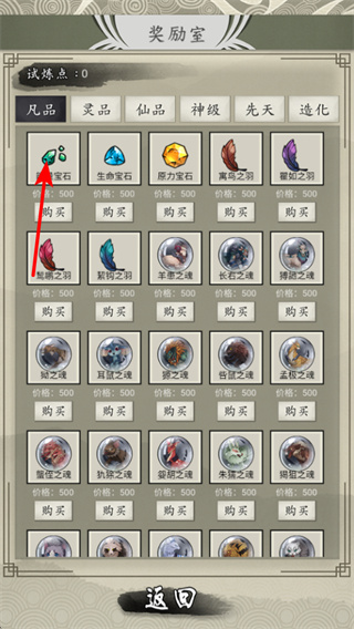 3、進(jìn)入獎勵室兌換界面,消耗試煉點(diǎn)優(yōu)先兌換靈石,其次是生命力石,靈石用于召喚異獸,生命力石提升異獸生存,確保資源向核心養(yǎng)成方向傾斜。