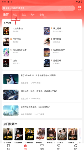 1、打開小說閱讀應(yīng)用,點(diǎn)擊男生分類標(biāo)簽,進(jìn)入男生小說分類頁面。