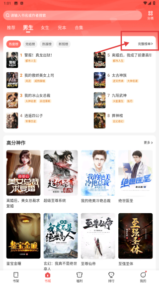 2、在男生小說分類頁面,點(diǎn)擊完本榜單標(biāo)簽,瀏覽完本小說榜單內(nèi)容。