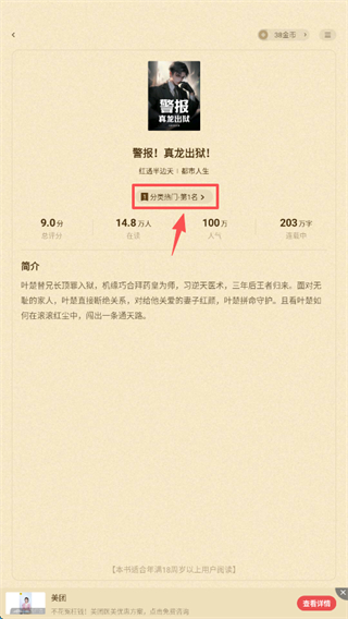 4、在小說詳情頁,可查看該小說的分類熱門第1名等詳情信息。