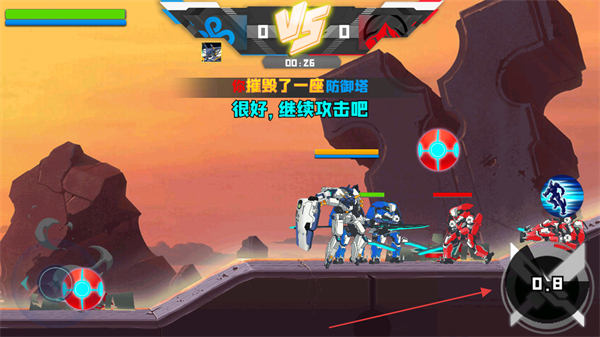 3、當(dāng)有敵方紅色機(jī)甲來襲時(shí),點(diǎn)擊攻擊鍵摧毀防御塔擊敗敵方機(jī)甲,推進(jìn)對(duì)戰(zhàn)進(jìn)度。