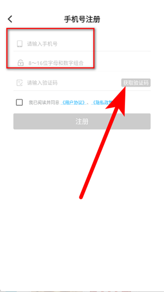 3、在手機(jī)號(hào)注冊(cè)頁(yè)面,輸入手機(jī)號(hào),點(diǎn)擊獲取驗(yàn)證碼。