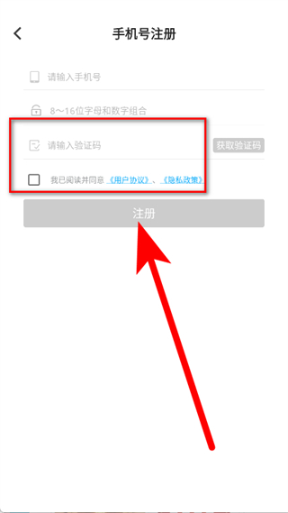 4、輸入驗(yàn)證碼,勾選協(xié)議后,點(diǎn)擊注冊(cè),完成賬號(hào)注冊(cè)。
