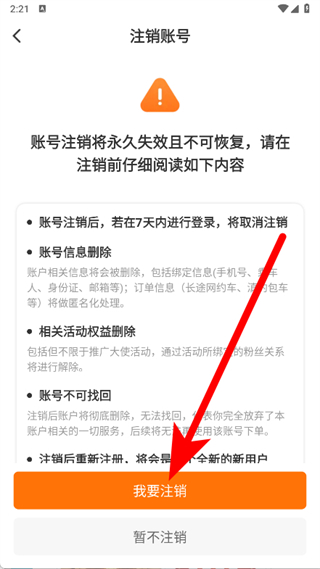 5、仔細(xì)閱讀賬號注銷須知后,點(diǎn)擊我要注銷按鈕,完成賬號注銷操作。