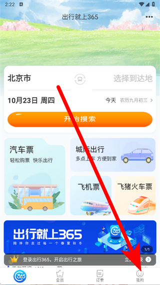 1、打開(kāi)出行365,點(diǎn)擊頁(yè)面底部的我的,進(jìn)入個(gè)人中心頁(yè)面。
