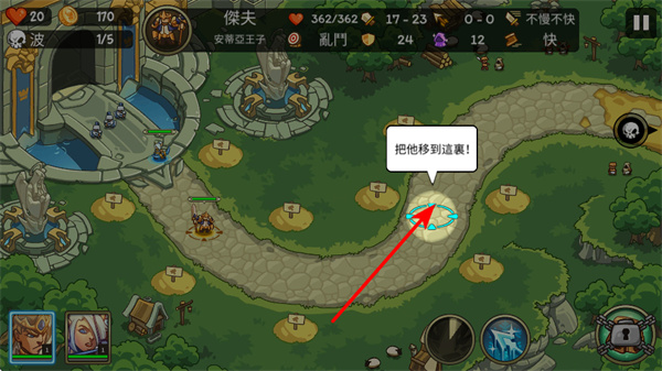 3、在英雄移動提示區(qū)域,點擊把他移到這的目標位置,將英雄部署至戰(zhàn)略點,部署時需結(jié)合敵人路徑,優(yōu)先選擇靠近敵人密集的區(qū)域。
