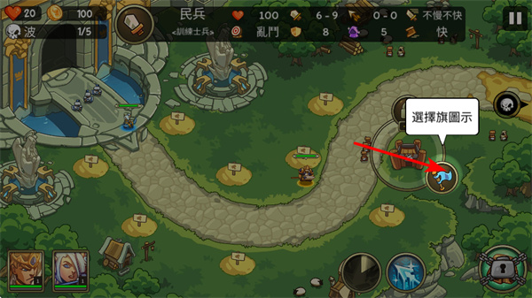 4、進入游戲戰(zhàn)斗界面后,點擊選擇旗幟圖示按鈕,這是部署英雄的關(guān)鍵操作,準確點擊可將英雄移動至指定區(qū)域,開啟前線作戰(zhàn)。