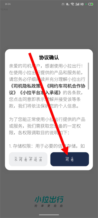 1、打開(kāi)小拉出行司機(jī)端,在協(xié)議確認(rèn)頁(yè)面,仔細(xì)閱讀并接受條款,點(diǎn)擊同意。