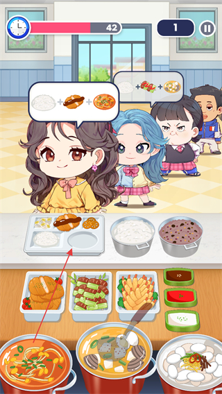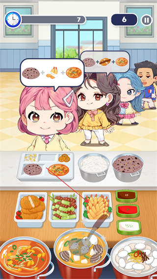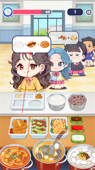 4、根據(jù)不同學(xué)生的餐食需求,快速選取對(duì)應(yīng)的食材組合,不斷完成打飯任務(wù),提升關(guān)卡進(jìn)度和得分。