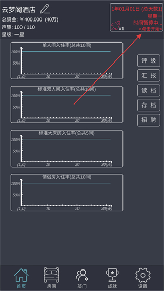 1、關(guān)注1年01月01日總天數(shù):0等時(shí)間信息,查看酒店總資金、聲望和星級(jí),了解經(jīng)營(yíng)基礎(chǔ)數(shù)據(jù)。