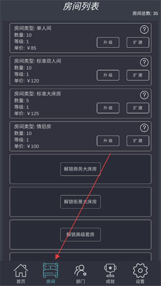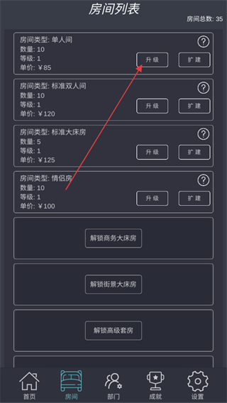 4、在房間列表中,點(diǎn)擊升級(jí)按鈕,提升單人間等房型的品質(zhì),以增加收入和聲望。