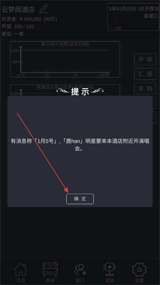 3、出現(xiàn)提示事件時(shí),點(diǎn)擊確定,及時(shí)處理如明星演唱會(huì)等消息,把握經(jīng)營(yíng)機(jī)遇。