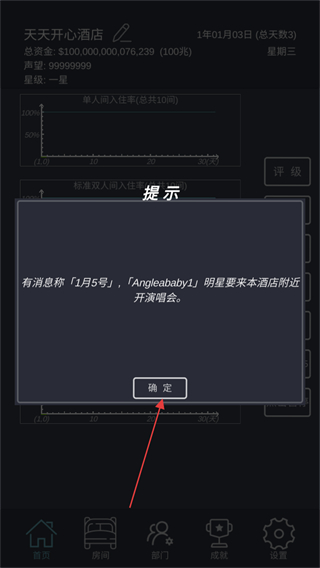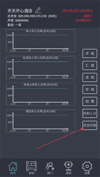 1、點擊點擊開始,推進游戲時間,開始酒店經(jīng)營。
