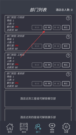 3、在部門列表中,點擊招聘,為行政部等部門招募員工。