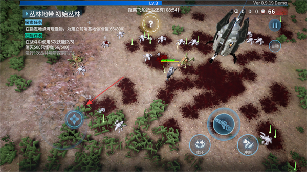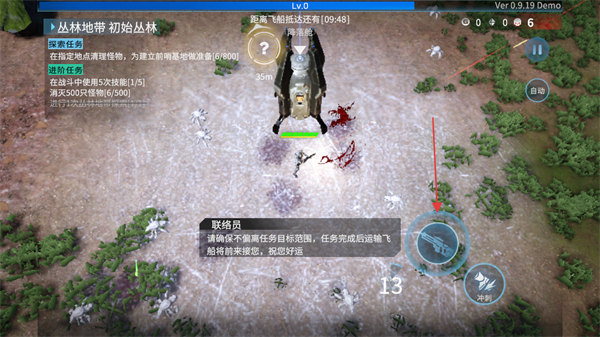 2、左下角輪盤控制星際傭兵在叢林地帶消滅怪物,推進(jìn)探索任務(wù)。