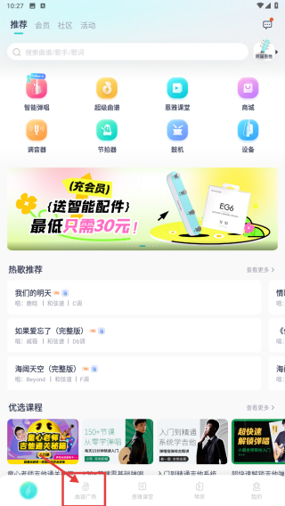 1、打開音樂學(xué)習(xí)應(yīng)用,點(diǎn)擊底部曲譜廣場(chǎng)選項(xiàng),進(jìn)入曲譜廣場(chǎng)頁(yè)面。