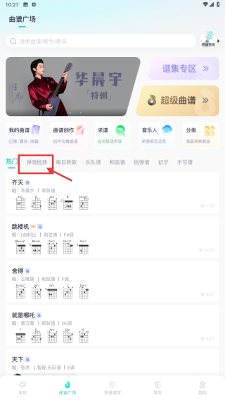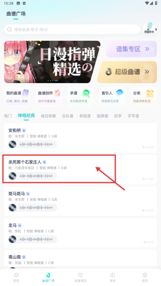 2、在曲譜廣場(chǎng)頁(yè)面,點(diǎn)擊彈唱經(jīng)典分類,瀏覽經(jīng)典彈唱曲譜列表。