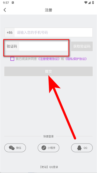 4、輸入收到的驗證碼,勾選同意后,點(diǎn)擊提交,完成賬號注冊。