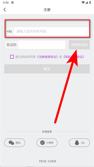 3、在注冊頁面,輸入手機(jī)號碼,點(diǎn)擊獲取驗證碼。