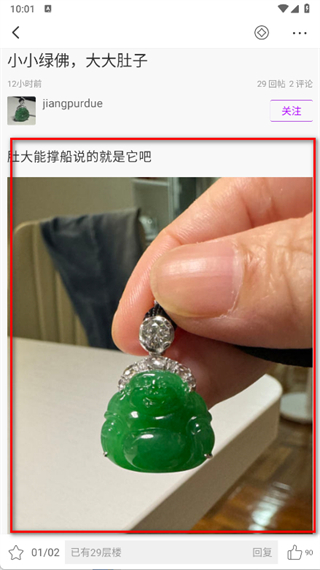 4、在帖子詳情頁,查看翡翠相關(guān)的圖片、文字介紹及評論,深入了解翡翠飾品的細節(jié)與交流信息。