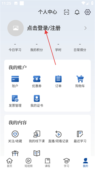 2、在個(gè)人中心頁面,點(diǎn)擊點(diǎn)擊登錄注冊(cè)可進(jìn)入登錄注冊(cè)頁面。