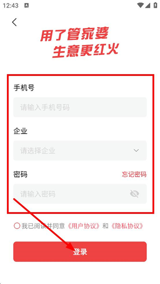 3、在賬號密碼登錄頁面,輸入手機號、選擇企業(yè)、輸入密碼,點擊登錄,完成賬號登錄。