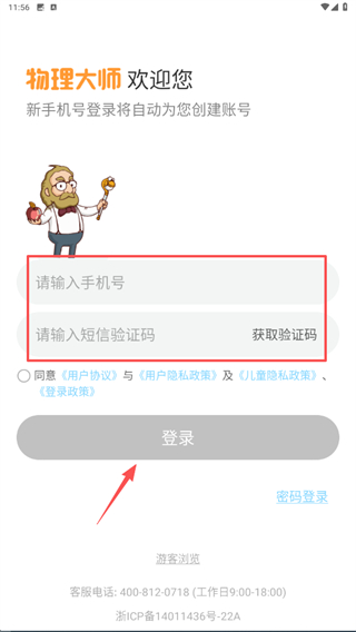 4、在手機(jī)號(hào)驗(yàn)證碼登錄頁面,輸入手機(jī)號(hào)和短信驗(yàn)證碼后點(diǎn)擊登錄按鈕,完成賬號(hào)登錄操作。