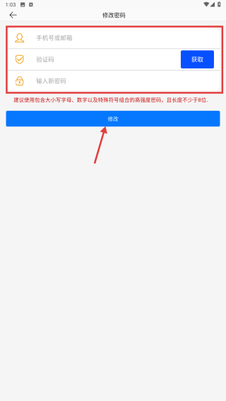 4、在密碼修改頁面,輸入手機(jī)號或郵箱、驗(yàn)證碼及新密碼后點(diǎn)擊修改按鈕,完成密碼修改操作。