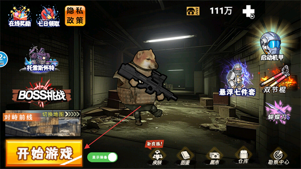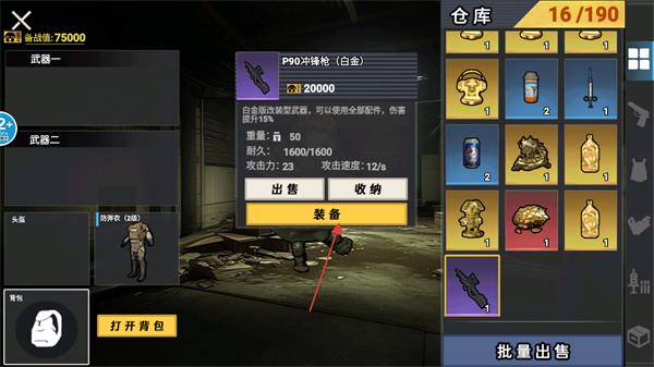 1、打開倉庫點擊裝備,裝配P90沖鋒槍,提升戰(zhàn)力。