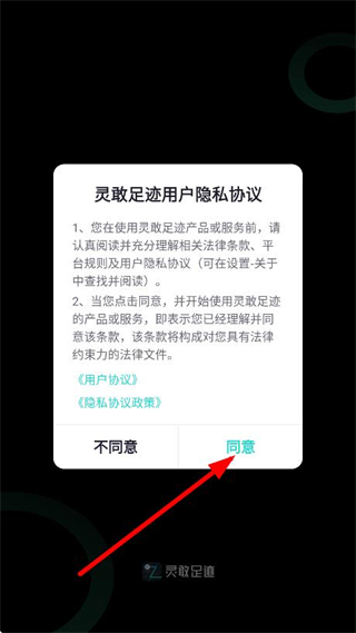 1、在靈敢足跡用戶隱私協(xié)議彈窗中,點(diǎn)擊同意,進(jìn)入首頁(yè)。