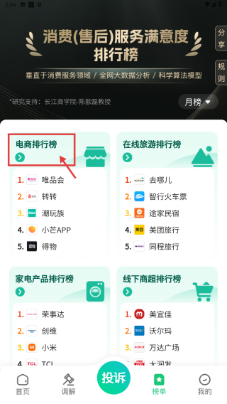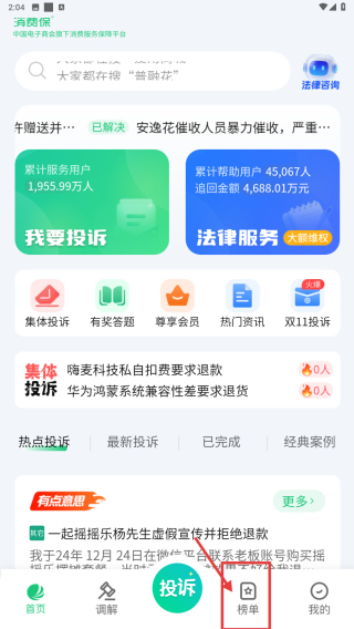 1、打開投訴類應(yīng)用,點(diǎn)擊底部榜單選項,進(jìn)入榜單頁面。