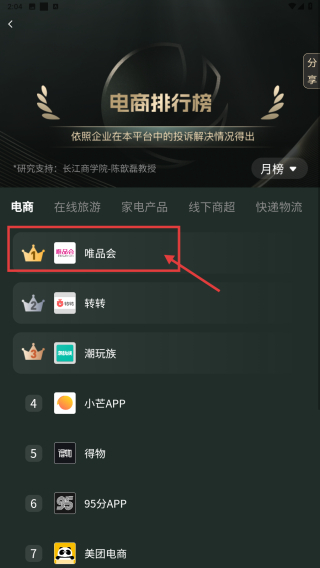3、在排名列表里,找到唯品會條目,點(diǎn)擊進(jìn)入品牌主頁。