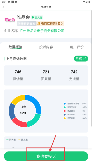 4、在品牌主頁,點(diǎn)擊我也要投訴按鈕,發(fā)起對唯品會的投訴操作。