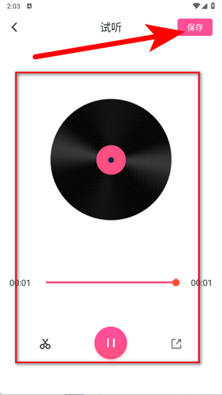 4、裁剪完成后,進(jìn)入試聽頁(yè)面,點(diǎn)擊右上角保存即可。