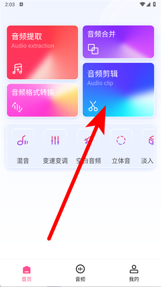 1、打開視頻音頻提取器,進(jìn)入首頁(yè),點(diǎn)擊音頻剪輯功能選項(xiàng)。