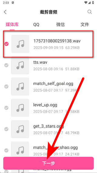2、進(jìn)入裁剪音頻頁(yè)面,在媒體庫(kù)中選擇需要剪輯的音頻文件,點(diǎn)擊下一步。