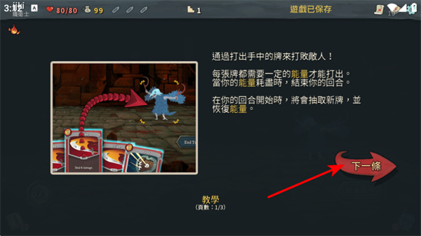 3、戰(zhàn)斗教學(xué)環(huán)節(jié),點(diǎn)擊下一條按鈕,這是推進(jìn)教學(xué)流程的關(guān)鍵步驟,需依次查看教學(xué)內(nèi)容,掌握出牌、能量管理等戰(zhàn)斗基礎(chǔ)規(guī)則。