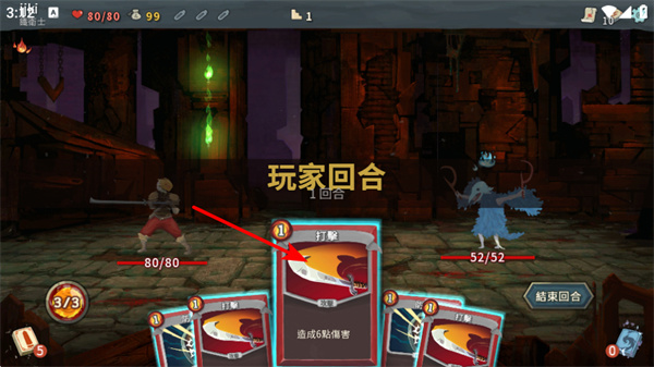 4、進(jìn)入戰(zhàn)斗回合后,點(diǎn)擊手中的攻擊卡牌如打擊,這是發(fā)起攻擊的基礎(chǔ)操作,需根據(jù)卡牌能量消耗與傷害效果,出牌時(shí)機(jī)以擊敗敵人。