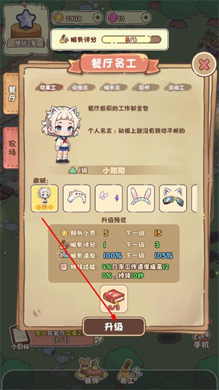 3、進(jìn)入員工界面,消耗道具升級(jí)員工,提升員工的服務(wù)速度、服務(wù)評(píng)分等屬性,讓餐廳運(yùn)營更高效。