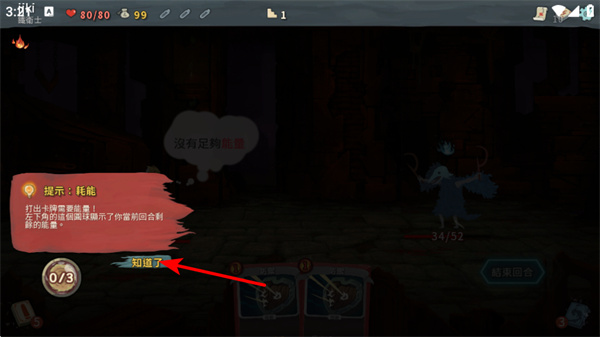 3、遇到?jīng)]有足夠能量提示時(shí),點(diǎn)擊知道了按鈕,這是關(guān)閉提示的基礎(chǔ)操作,關(guān)閉后需調(diào)整出牌策略,優(yōu)先低能量消耗卡牌。