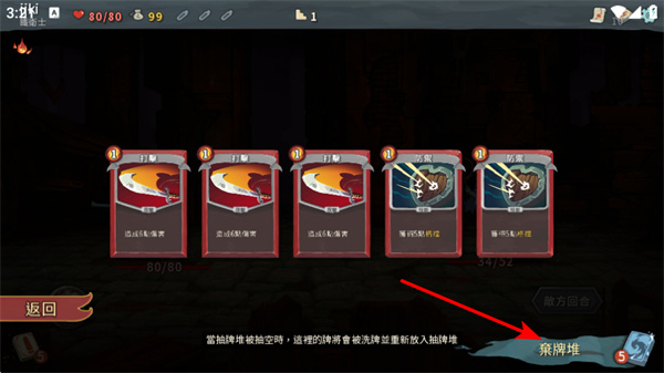 2、當(dāng)抽牌堆抽空時(shí),點(diǎn)擊棄牌堆按鈕,這是補(bǔ)充手牌的關(guān)鍵操作,棄牌堆會(huì)重新洗入抽牌堆,為玩家提供新的卡牌選擇。