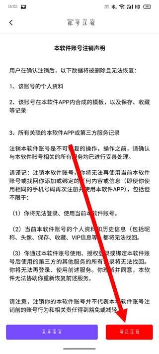 4、在賬號注銷頁面,仔細(xì)閱讀后,點擊確認(rèn)注銷按鈕,完成賬號注銷。